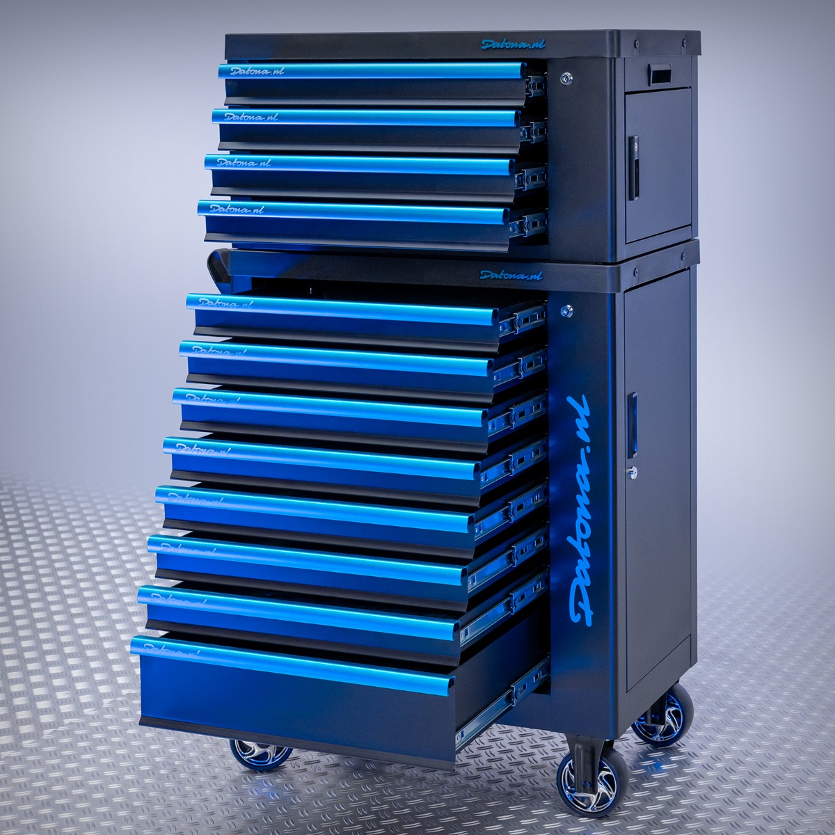 Deze ruime combinatie bestaat uit een sterke en ruime gereedschapswagen met topkist van Datona. Een fijne en onmisbare opbergcombinatie voor het veilig opbergen van al je gereedschappen. De matzwarte, krasvaste poedercoating in combinatie met de glanzend blauwe strips aan de voorzijde van iedere lade geven deze gereedschapskar een tof en luxe uiterlijk. De gereedschapswagen wordt exclusief gereedschap geleverd, superhandig voor de doe-het-zelver of professional met veel gereedschap. Of richt de wagen in met de gereedschapsets en modules van Datona.
