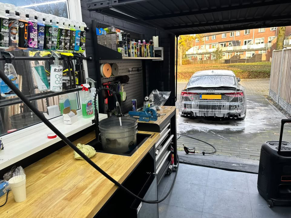 Buiten staat de auto in de foam, binnen is het strak georganiseerd met rekken, gatenborden en slanghaspels. Dit is zo’n oplossing die je één keer ziet en denkt: waarom deed ik dit zelf niet eerder?