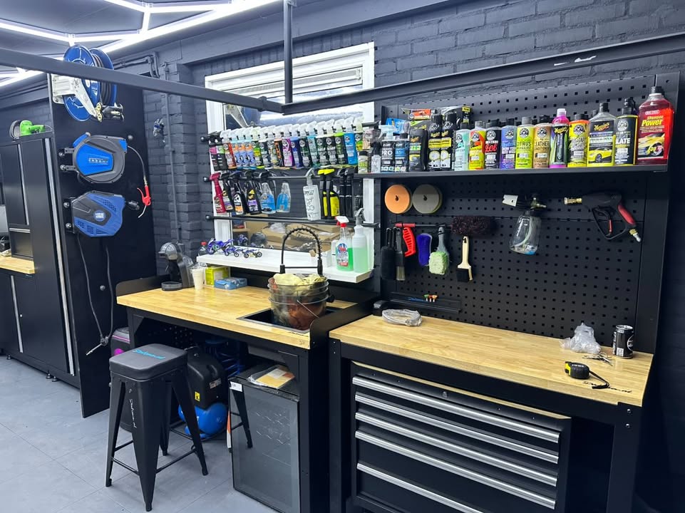 Wat deze setup zó fijn maakt, is dat je alles bij de hand hebt: je vult je emmer en spoelt doekjes uit op één plek, en je kunt meteen weer door. Het rommelige werk gebeurt in de wasbak, waardoor je werkblad verder schoon en overzichtelijk blijft. Je verliest geen tijd meer met heen en weer lopen naar een kraan ergens verderop. En omdat de bak mooi matcht met de rest van de werkplaats en de verlichting, oogt alles strak en professioneel—alsof het altijd al zo bedoeld was!