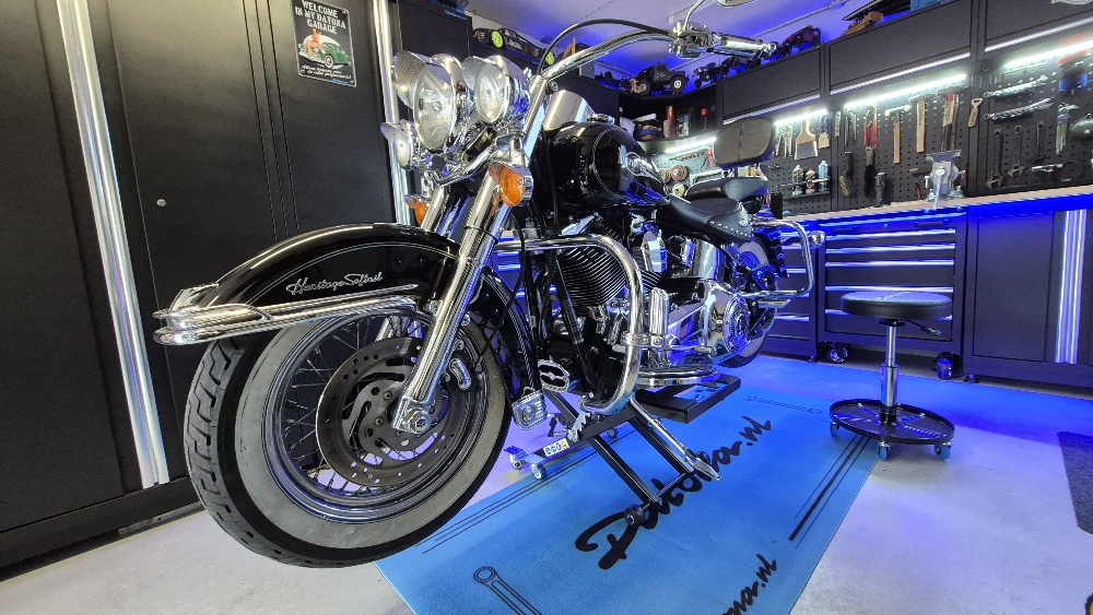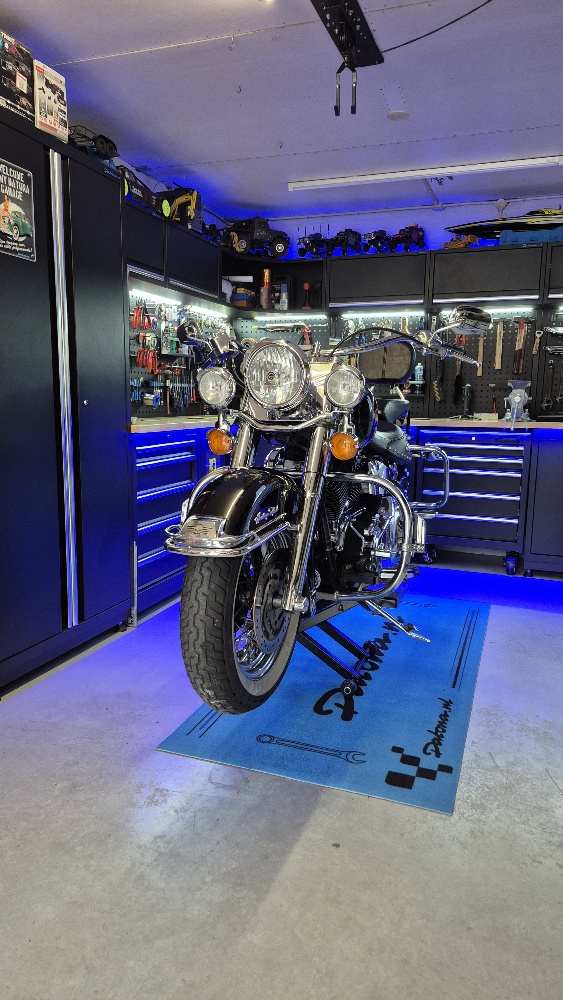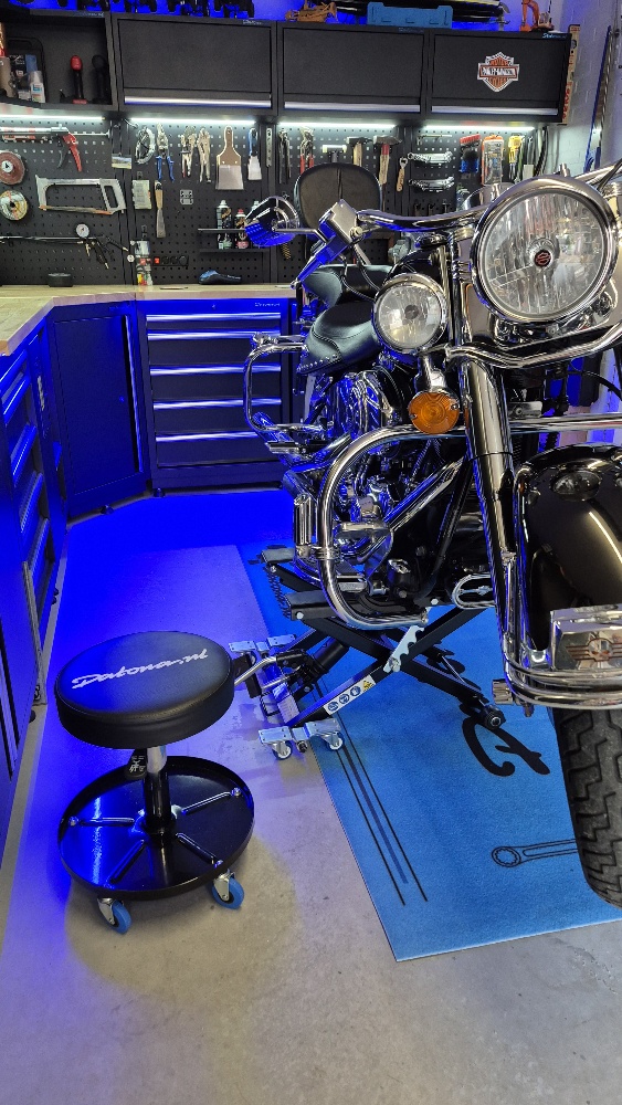 In het hart van de garage staat de Harley. Dankzij de Harleylift staat die in een handomdraai stabiel en op hoogte; afstellen, reinigen of een set nieuwe remblokken monteren gaat relaxed en ergonomisch. Onder de motor ligt een Datona milieumat: die vangt olie- en reinigingsresten op en houdt de vloer schoon—ideaal als je even een filter losdraait of de boel ontvet. Met de verrijdbare werkplaatskruk schuif je moeiteloos rondom het blok.