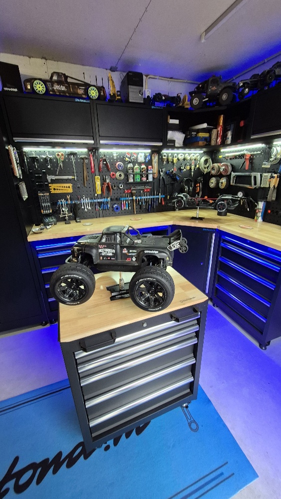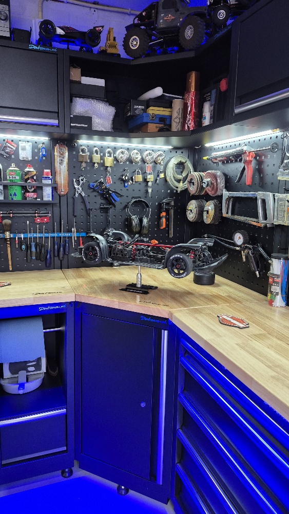 Wat deze werkplaats ook sterk maakt, is de veelzijdigheid. De klant bouwt en onderhoudt niet alleen de motor, maar beoefend hier ook andere hobby's. De stabiele werkbank met houten blad dempt trillingen en is groot genoeg om chassis, elektronica en bodyparts overzichtelijk uit te leggen. Heldere LED-verlichting langs de kasten geeft schaduwvrij licht—fijn voor het echte precisiewerk.