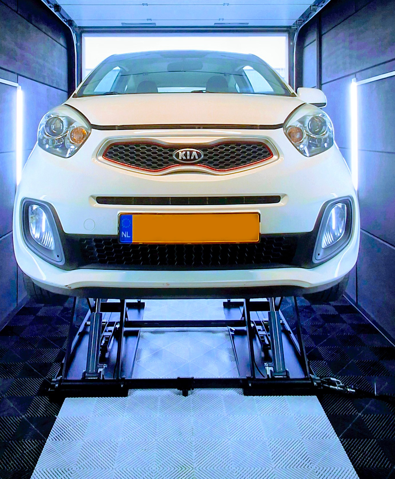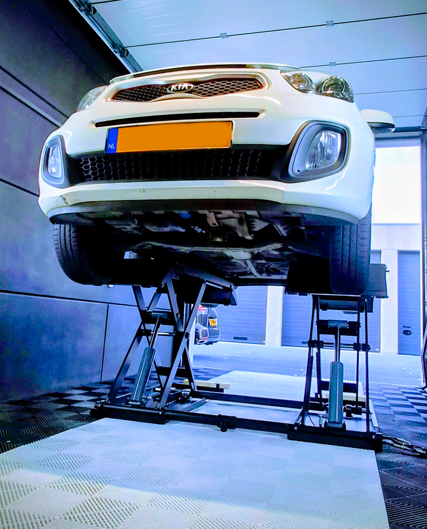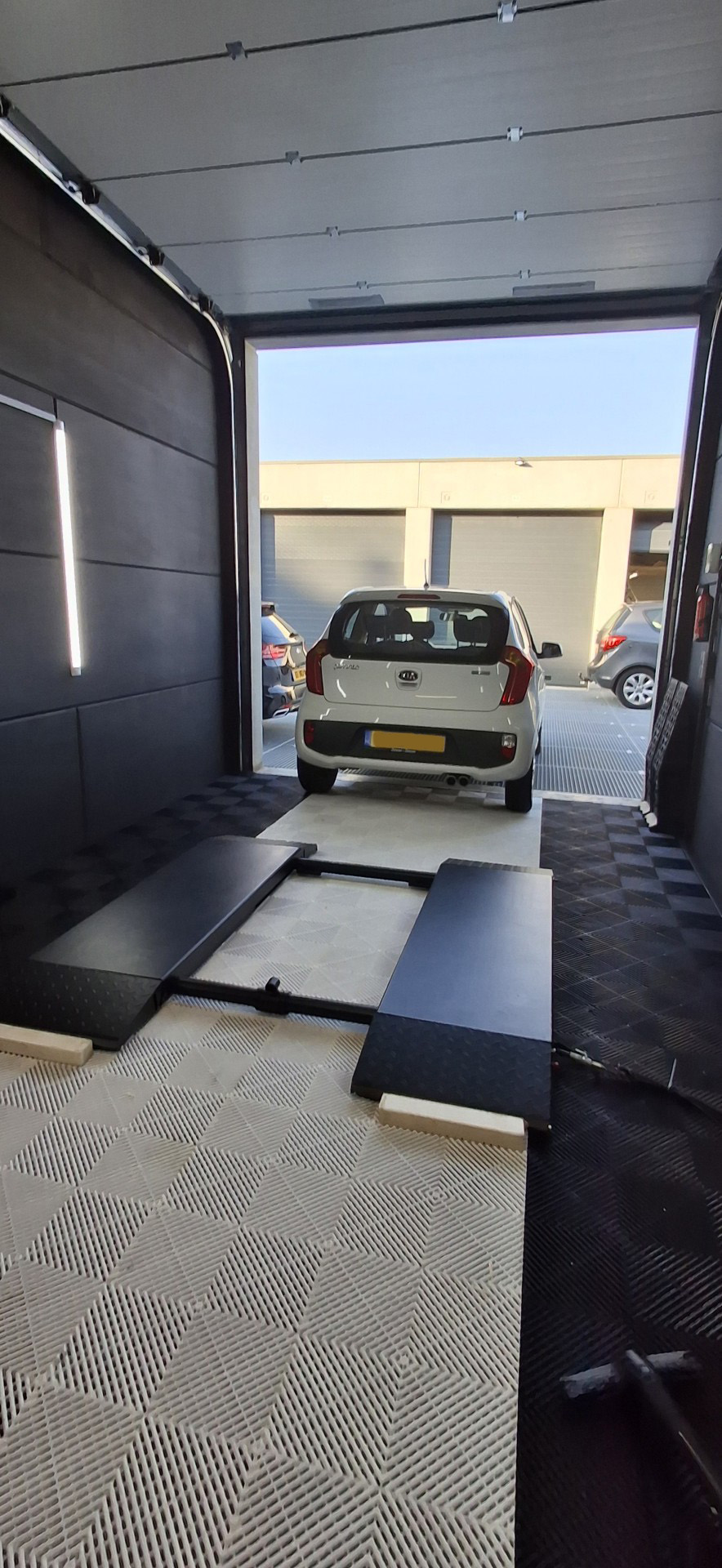 Bij deze klant zie je hoe een gewone garage verandert in een échte werkplek. De auto rijdt naar binnen, de verrijdbare schaarbrug gaat omhoog en er is meteen rust en overzicht. Met de strakke vloertegels en wandverlichting is het een plek waar je graag sleutelt—van een snelle bandenwissel tot een remklus of uitlaatcheck. Het resultaat is voelbaar: je hoeft jezelf niet meer in gekke bochten te wringen om aan de auto te sleutelen.