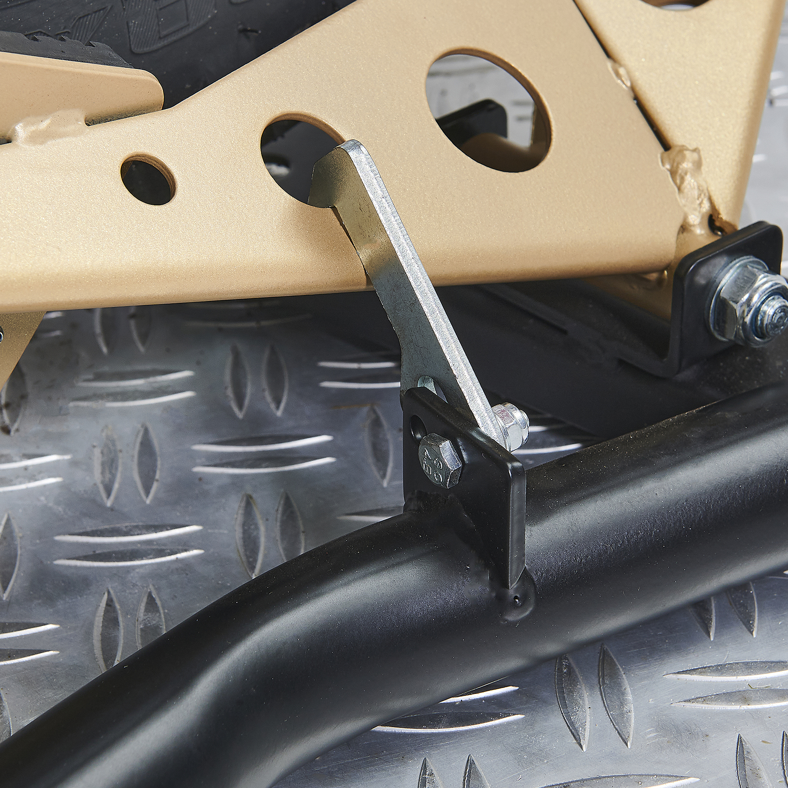 Solide poedercoating – De combinatie van zwarte en goudkleurige onderdelen geeft niet alleen een stoere uitstraling, maar beschermt ook tegen krassen en roest. De opvallende gouden kantelaar laat duidelijk zien waar het wiel moet komen. De inrijklem is ook te verkrijgen in een rode variant.