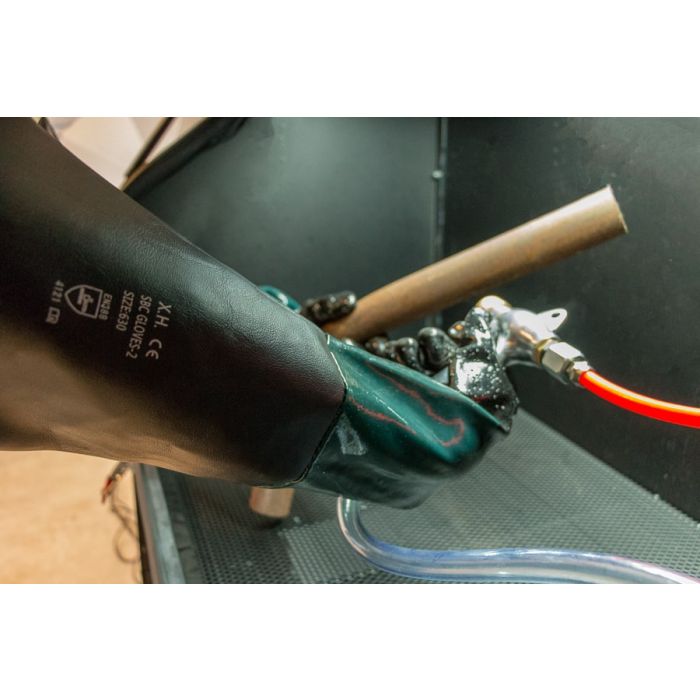 Naast bovenstaande voordelen heeft deze straalbox nog veel meer handige eigenschappen om jou in staat te stellen je onderdelen en projecten grondig te reinigen. De grote voordeur maakt het ten eerste zeer eenvoudig om grote werkstukken te plaatsen. Verder beschermen de handschoenen je handen tijdens het stralen en heb je veel bewegingsvrijheid dankzij de inhoud van 420 liter. Een ander voordeel van deze straalcabine is dat het gebruikte straalmiddel continu opnieuw aangezogen wordt waardoor je veel straalgrit bespaart. Als je het straalmiddel wil vervangen, kun je het oude straalgrit gemakkelijk verwijderen met behulp van de afvoer.