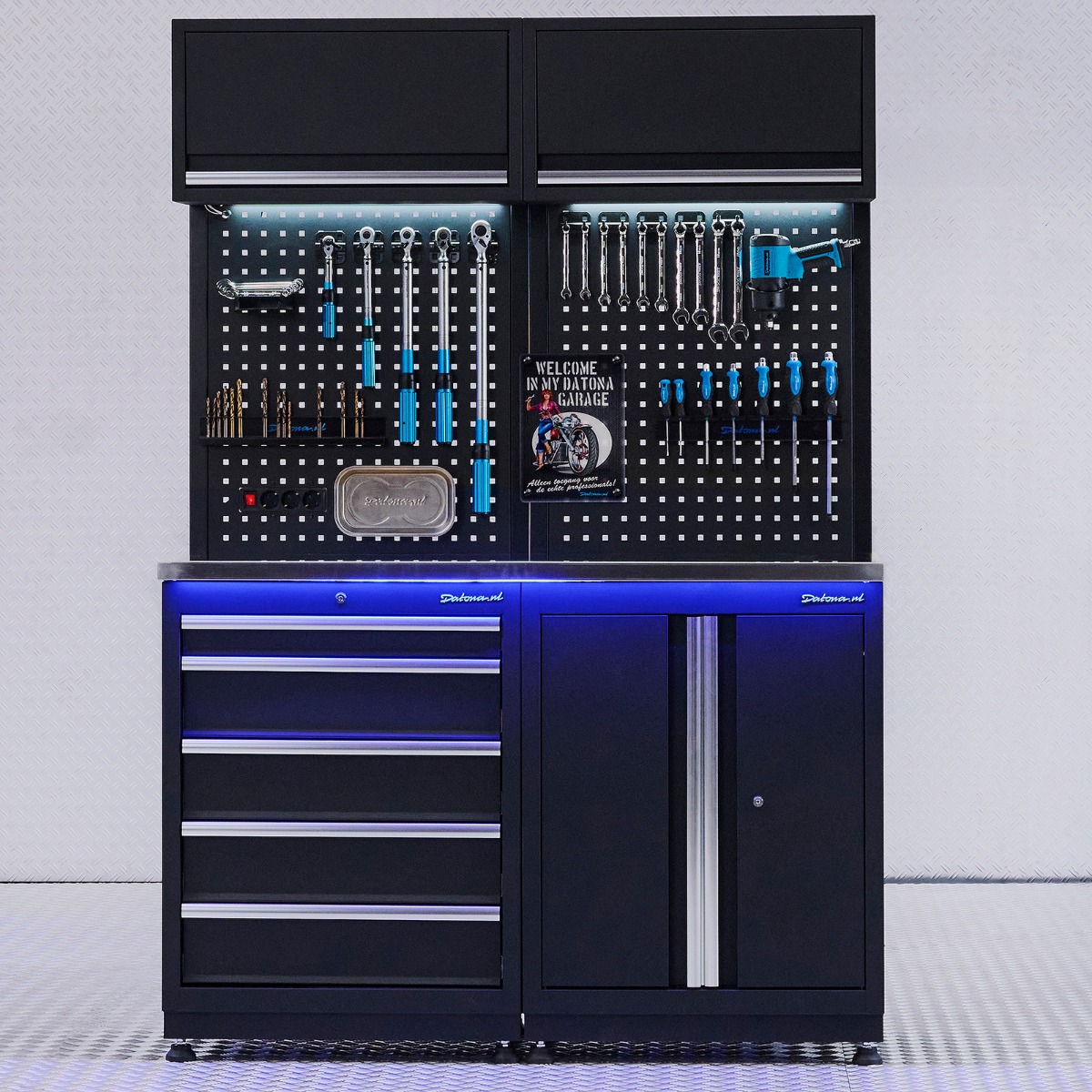 Deze premium Datona werkplaatsinrichting met RVS werkblad van Datona is speciaal gemaakt voor doe-het-zelvers, hobbyisten en professionele sleutelaars. De garage inrichting is voorzien van allerlei handige eigenschappen, zoals LED-verlichting, verstelbare poten, afsluitbare kasten, gatenborden voor het ophangen van gereedschap en stopcontacten voor je elektrische apparatuur.