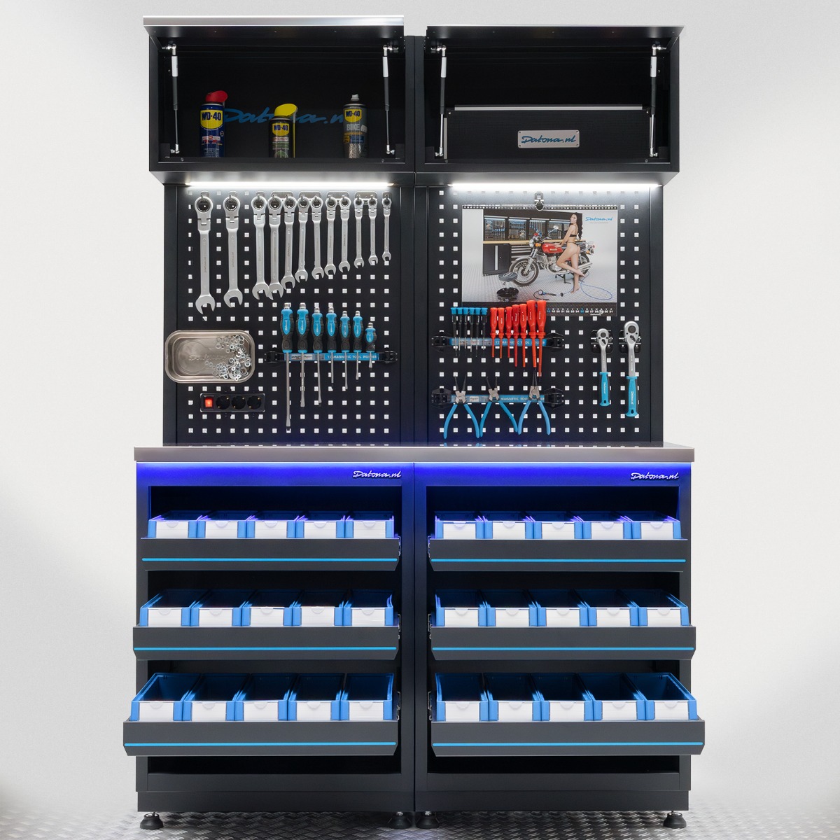 Of je nu hobbymatig sleutelt of dagelijks met gereedschap werkt: deze premium werkplaatsinrichting helpt je om overzicht te houden én productiever te werken. Vragen over hoe jij jouw werkplaats optimaal kunt inrichten? Neem contact op met onze experts van de klantenservice of kom langs in de showroom, we helpen je graag verder!